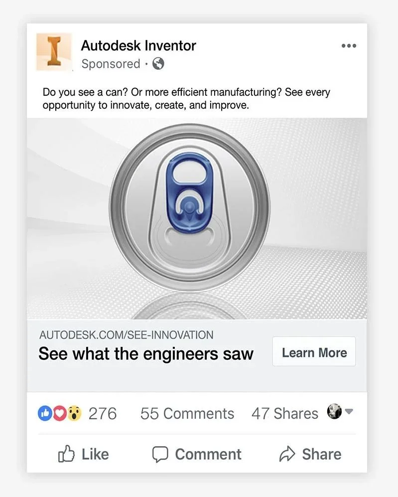 We asked engineers what they sawAutodesk helps them see more Everyday objects are actually more complicated than we think A website redesign that opens with a demo reel increased their leads by 1000% We then asked questions that led back to the site Banners with everyday objects asked questions to engineers.They clicked to find the answer Social videos of companies seeing more using Autodesk Engineers saw our post and reacted. Role: Concept, Art Direction, DesignCW: Trevor RobertsonCD: Mindy Sears